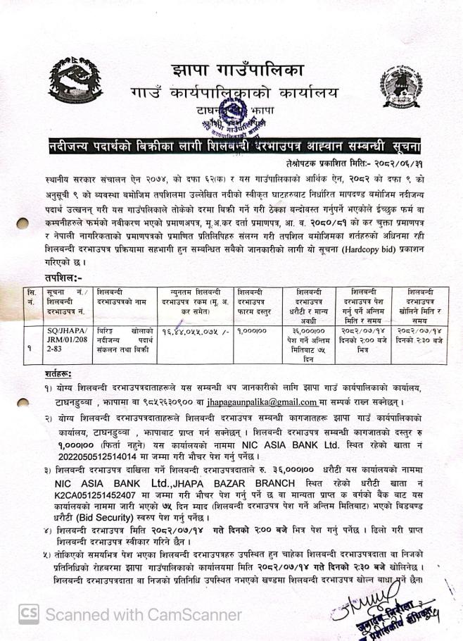 नदीजन्य पदार्थको बिक्रीका लागि शिलबन्दी दरभाउपत्र आह्वान सम्बन्धी सूचना ||