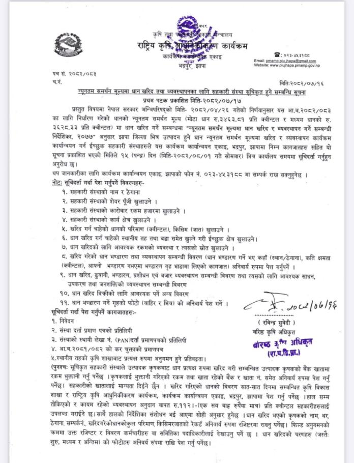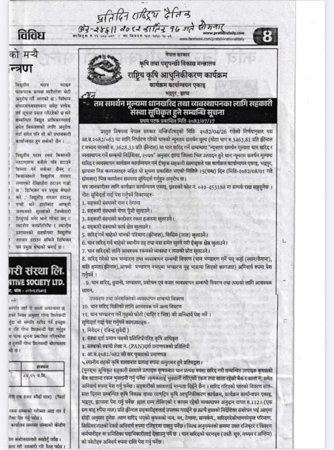 नयूनतम समर्थन मुल्यमा धान खरिद तथा व्यवस्थापनका लागि सहकारी संस्था सूचिकृत हुने सम्बन्धि सूचना ।