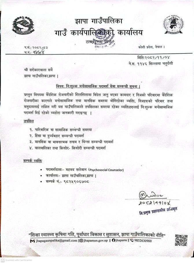 नि:शुल्क मनोसामाजिक परामर्श सेवा सम्बन्धी सूचना ||