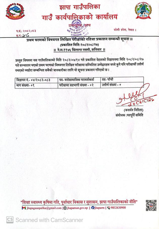 पद :- मनोसामाजिक परामर्शकर्ताको प्रथम चरणको बिषयगत लिखित परिक्षाको नतिजा प्रकाशन सम्बन्धमा