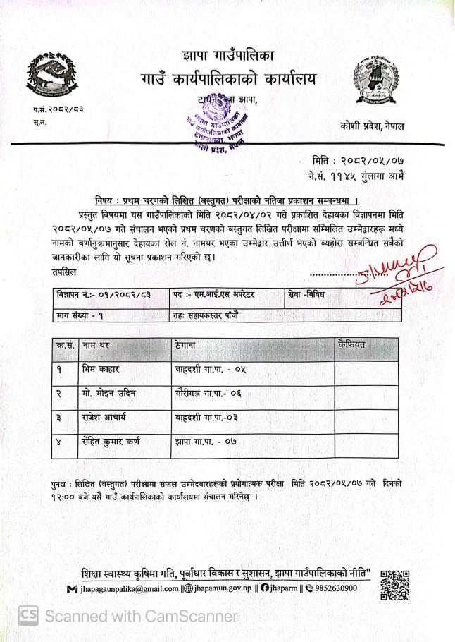 पद : MIS operator प्रथम चरणको लिखित(बस्तुगत) परिक्षाको नतिजा प्रकाशन सम्बन्धमा ||