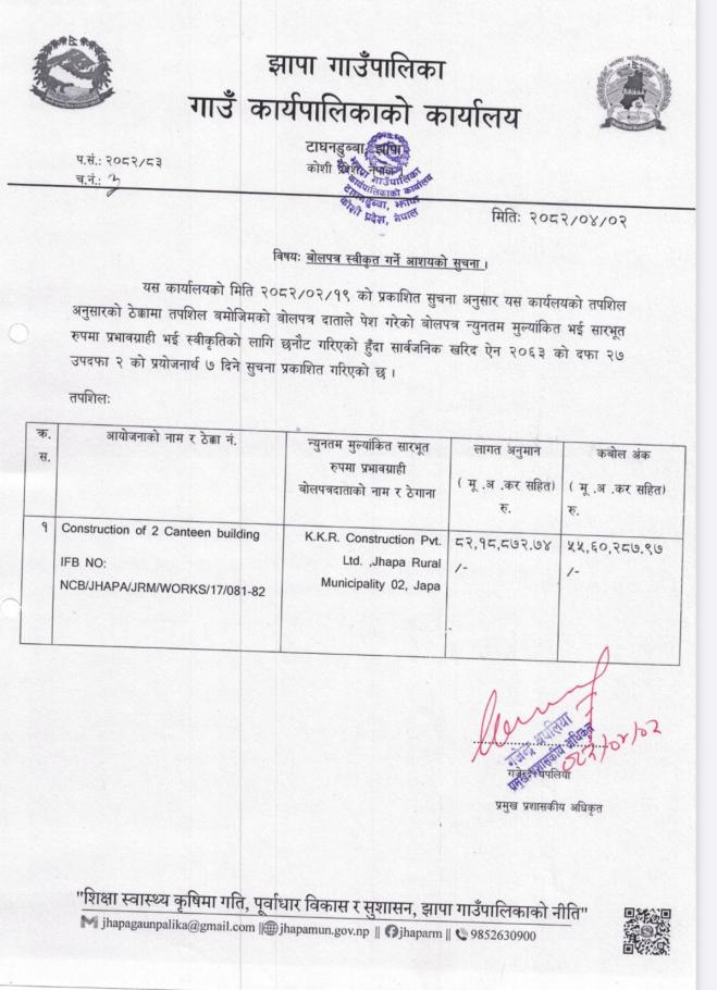 वोलपत्र स्वीकृत गर्ने आशयको सूचना ||