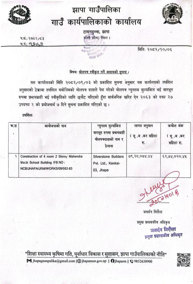 बोलपत्र स्वीकृत गर्ने आशयको सूचना ||