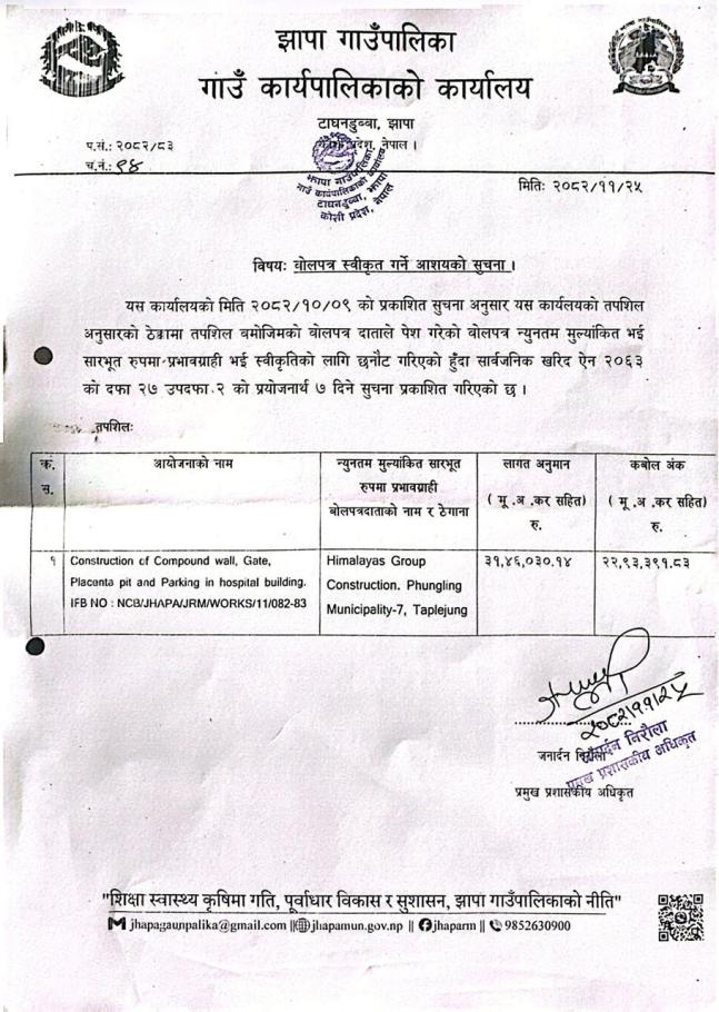 बोलपत्र स्वीकृत गर्ने आशयको सूचना ||