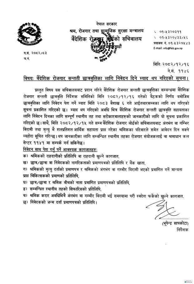 वैदेशिक रोजगार सन्तती छात्रवृत्तिका लागि निवेदन दिने म्याद थप गरिएको सूचना |