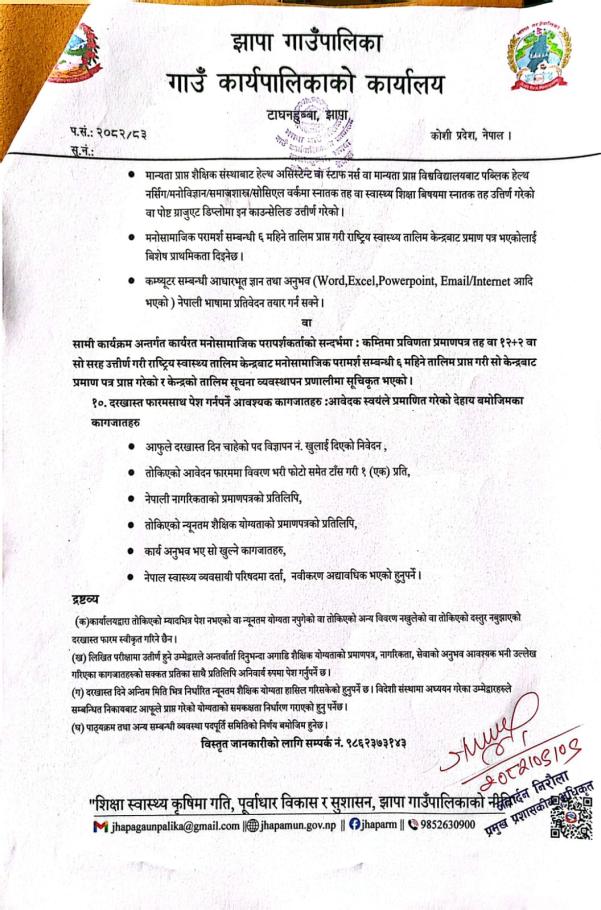 सेवा करारमा कर्मचारी पदपुर्ती सम्बन्धी सूचना || पद: मनोसामाजिक परामर्शकर्ता