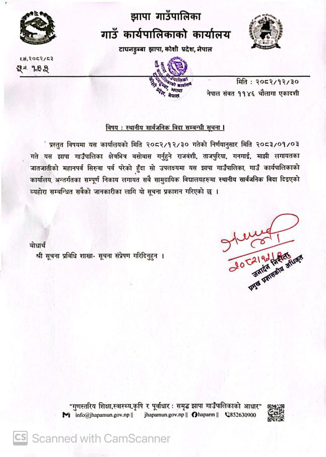 » स्थानीय सार्वजनिक विदा सम्बन्धी सूचना ||