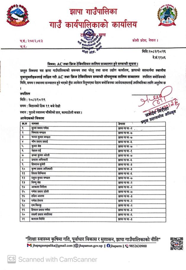 » AC तथा फ्रिज टेक्निसियन तालिम सञ्चालन हुने सम्बन्धी सूचना ||