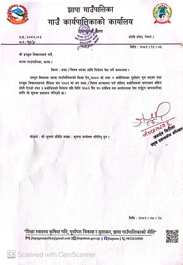 » कक्षा/ विषय थपका लागि निवेदन पेश गर्ने सम्बन्धम ||