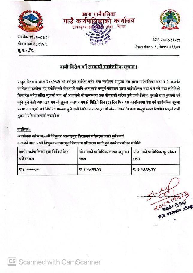 दावी विरोध गर्ने सम्बनधी सार्वजनिक सूचना ||