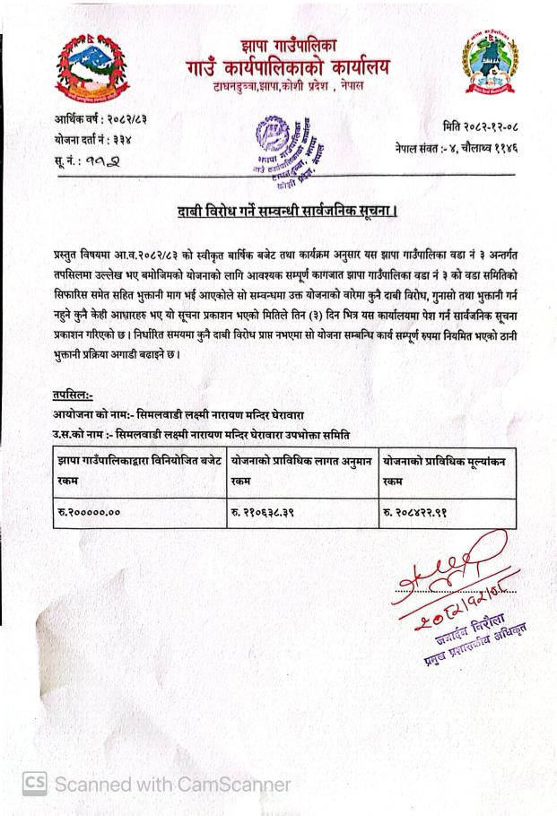 दावी विरोध गर्ने सम्बनधी सार्वजनिक सूचना ||