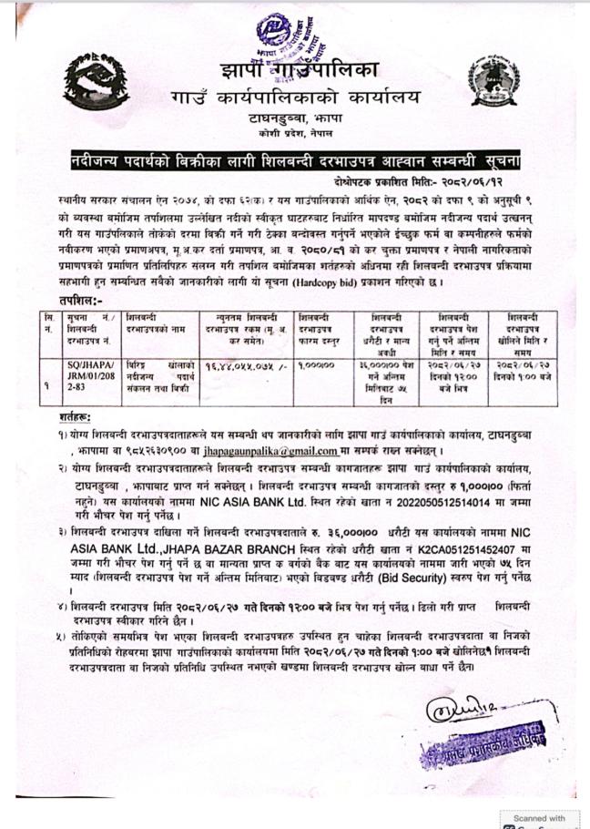 नदीजन्य पदार्थको बिक्रीका लागि शिलबन्दी दरभाउपत्र आह्वान सम्बन्धि दोश्रोपटक प्रकाशित सूचना ||