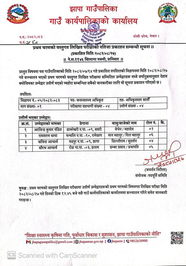 पद:- जनस्वास्थ्य अधिकृतको प्रथम चरणको वस्तुगत लिखित परिक्षाको नतिजा प्रकाशन सम्बन्धमा