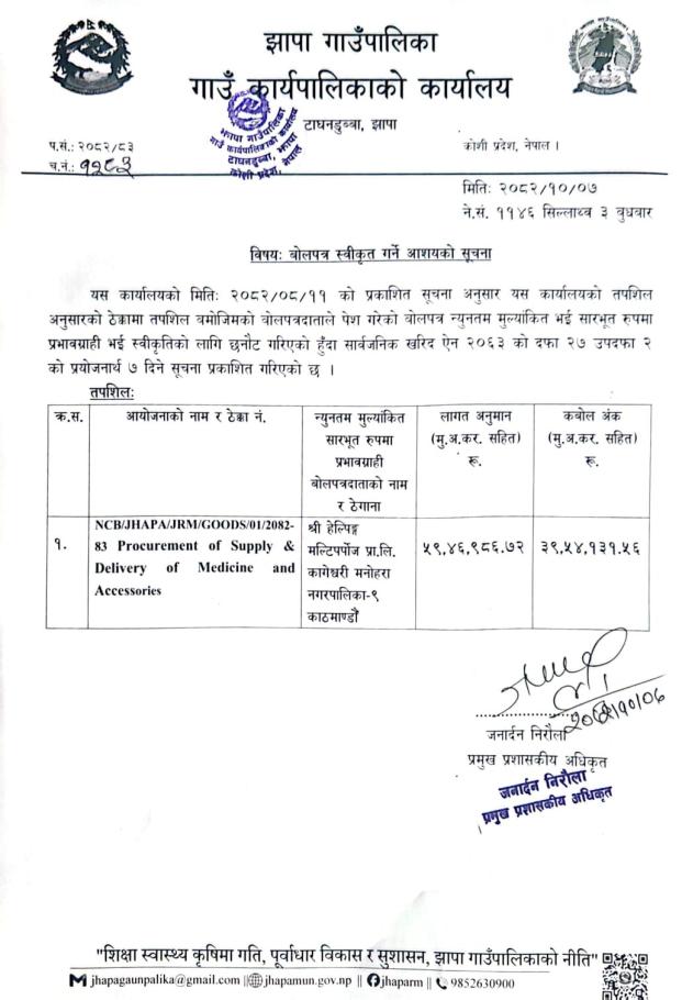 बोलपत्र स्वीकृत गर्ने आशयको सूचना ||