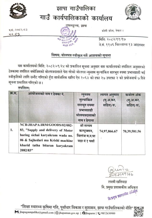 » बोलपत्र स्वीकृत गर्ने आशयको सूचना ||