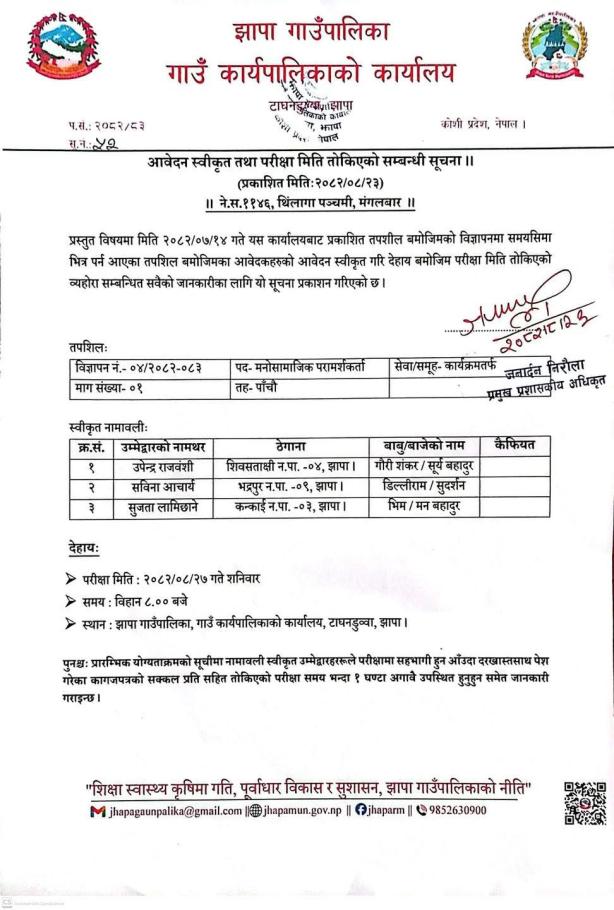 » मनाेसामाजिक परामर्शकर्ता पदकाे आवेदन स्वीकृत तथा परीक्षा मिति ताेकिएकाे सम्बन्धी सूचना ।