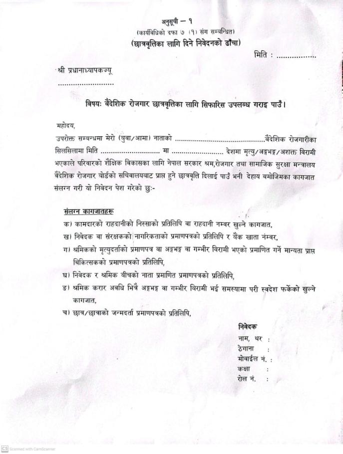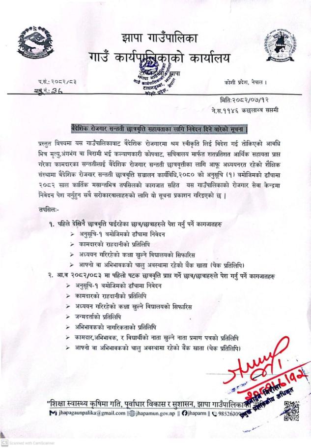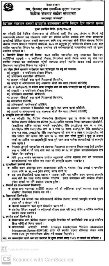 वैदेशिक रोजगार सन्तती छात्रवृति सहायताका लागि निवेदन दिने वारेको सूचना ||