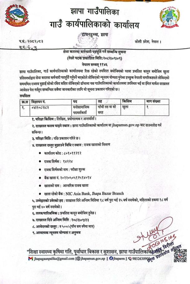 सेवा करारमा कर्मचारी पदपुर्ती सम्बन्धी सूचना || पद: मनोसामाजिक परामर्शकर्ता